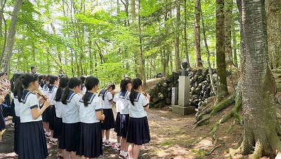 【6年生】軽井沢夏の学校「児童の報告」 2泊3日で、軽井沢夏の学校に行きました。日本女子大学軽井沢三泉寮に着いてから、成瀬仁蔵先生の胸像の前で決心の集いを行いました。目標を心にとめて2泊3日を過ごしていくことを誓いました。軽井沢は、5年生の時の菅平スコレーとは違い、配ぜんや掃除なども全て自分たちでします。