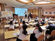 【6年生】社会科・大学との連携授業 今年も日本女子大学人間社会学部教育学科の田部俊充教授が、6年生のために社会科の授業をしてくださいました。田部教授は社会科教育がご専門で、いつも子どもたちが使っている教科書の地図帳の著者でもあります。