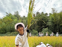 【5年生】「稲刈り」 西生田の水田で、5月に植えた苗の稲刈りを行いました。