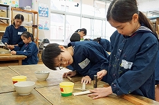 【留学生との交流】図工 5年生はなかよしフェスティバルのために、入国スタンプを彫っています。彫りあがると、授業の見学にいらした大学の留学生の方が、日本国内を旅行して集めたスタンプ帳を見せてくれました。