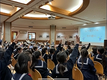 【5, 6年合同による総合的な学習の時間】 フリージャーナリストの村山祐介氏をお招きし、「戦下に生きる人たちと世界の今」というテーマで講演をして頂きました。最初に「移民」「難民」「国内避難民」の違いを教えて頂きました。その後、命がけで国境を越えて移動する人たちの姿を映像を交えながら紹介して頂きましたが、映像には同世代の子ども達の姿が多く見受けられ、子ども達は真剣な眼差しでその現実と向き合っていました。