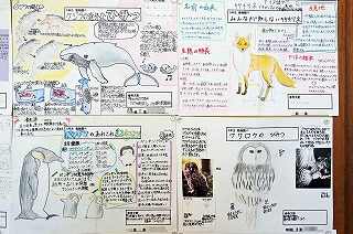 【生き物探求ポスター】 <5年生:理科> 5年生は夏休みの宿題「生き物探究ポスター」で、自分が好きな生き物を一つ選び、それについて調べて、ロイロノートという教育アプリでポスターに仕上げました。9月の授業では、一度提出したポスターをさらに深める活動をしました。 まず自分のポスターを分析し、『特に伝えたいことは何か』をロイロノートのシンキングツールを使って考え、まとめました。そして、それをテーマにプチプレゼン(Vol.14の記事参照)を行いました。聞き手は感想の時間で必ず質問をします。それを数回くり返しました。もらった質問はさらにその生き物について調べるためのヒントになります。それをポスターに反映することで、内容をより深めることができました。 そうしてブラッシュアップされたポスターは、どれも興味深いものに仕上がっています。掲示は植物、軟体動物、節足動物、脊索動物、魚類、両生類、爬虫類、鳥類、哺乳類の順に分類しました。同じ生き物でも人によって異なる視点で書かれていて、その違いからも子どもたちはたくさんの発見をしていました。