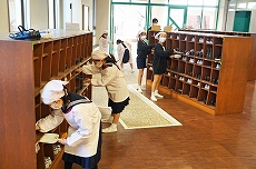 【3年生】バイキング給食 今日の給食は、待ちに待ったバイキング給食。3年生がうれしそうに多目的ホールに入ってきました。