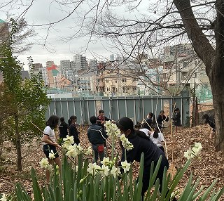 【自然教材園(がけ下)整備】<教員> 先日、新年度の始業を控えた春の日に、自然教材園(通称「崖下」)の整備作業をしました。本校には、都心部に位置しながらも、緑あふれる小さな林があり、年に数回、作業日を設けて教員が整備しています。 この日は主に通路や畑の草取りや葉の落ちた樹木の剪定をしたり、石畳みの石を運んだりしました。 作業が終わり、すっきりとした崖下は気持ちがよいです。これから明るい新緑の季節を迎えます。