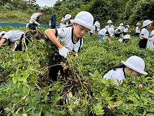 【収穫週間:ピーナッツ掘り】 <2年生:生活科> 秋は収穫のシーズン。豊明小学校では、川崎市多摩区にある日本女子大学西生田校地の農園で、各学年が収穫体験をします。 2年生は、ピーナッツ掘りに行きました。子どもたちは事前に、ピーナッツがどのように育つかを学習した後、収穫に臨みました。今回収穫したピーナッツは「おおまさりネオ」という品種で、かなりの大粒です。子どもたちは、土からピーナッツを掘り起こし、嬉しそうに袋に詰めていました。とれたてのピーナッツは、塩ゆでにすると、とてもおいしいそうです。お家でいただくのを楽しみに、みんな笑顔で帰りました。