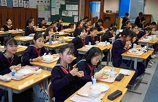 【3年生】バイキング給食 今日の給食は、待ちに待ったバイキング給食。3年生がうれしそうに多目的ホールに入ってきました。